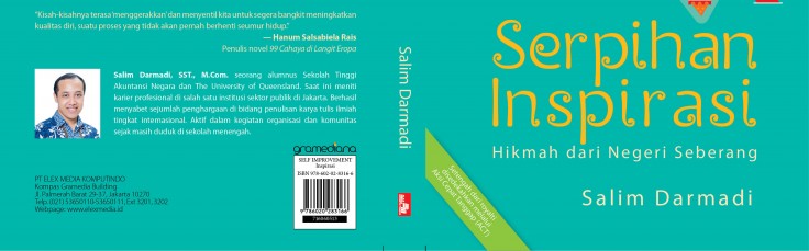 Hikmah dari Negeri Seberang_CoverAlhamdulillah, PT Elex Media Komputindo (Kelompok Gramedia) akhirnya telah memutuskan judul (calon) buku pertama saya. Judul yang disetujui adalah “Serpihan Inspirasi: Hikmah dari Negeri Seberang”. Saat artikel ini ditulis, buku tersebut akan segera memasuki proses pencetakan dan insyaallah akan terbit pada bulan April 2016 ini.