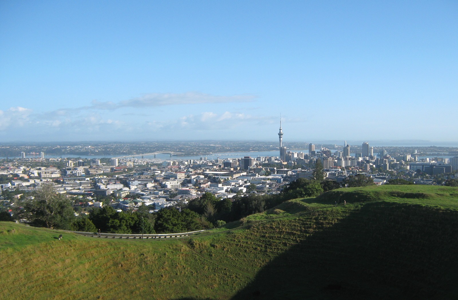 Dengan tenaga yang tersisa di bawah paparan sinar matahari musim panas, saya menapakkan langkah demi langkah menuju titik pengamatan tersebut. Ketika sampai di atas, saya memang kepayahan. Namun kelelahan tersebut seolah terbayar oleh pemandangan cantik metropolitan Auckland yang terletak di sebuah tanah genting di Pulau Utara ini, diapit oleh pelabuhan Manukau yang menghadap Laut Tasman dan pelabuhan Waitemata yang menghadap Samudra Pasifik.